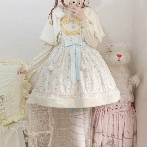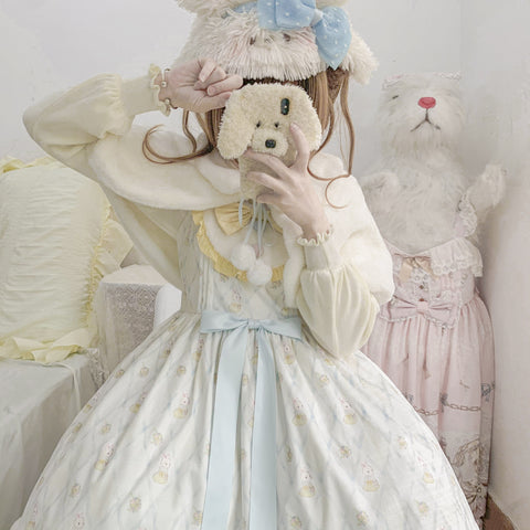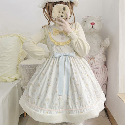 愛らしいうさぎ柄とパステルカラーが特徴のジャンパースカート。