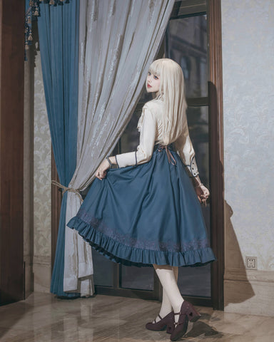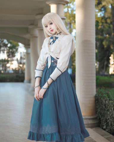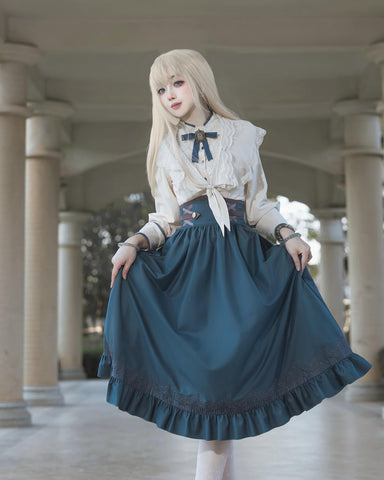 柔らかなアイボリーのブラウスと、深みのある青緑色のスカートが上品な印象を与える、クラシカルなセットアップです。胸元にはヴィンテージ調のブローチとリボンをあしらい、アンティークの図書館を思わせる知的で落ち着いた雰囲気に。